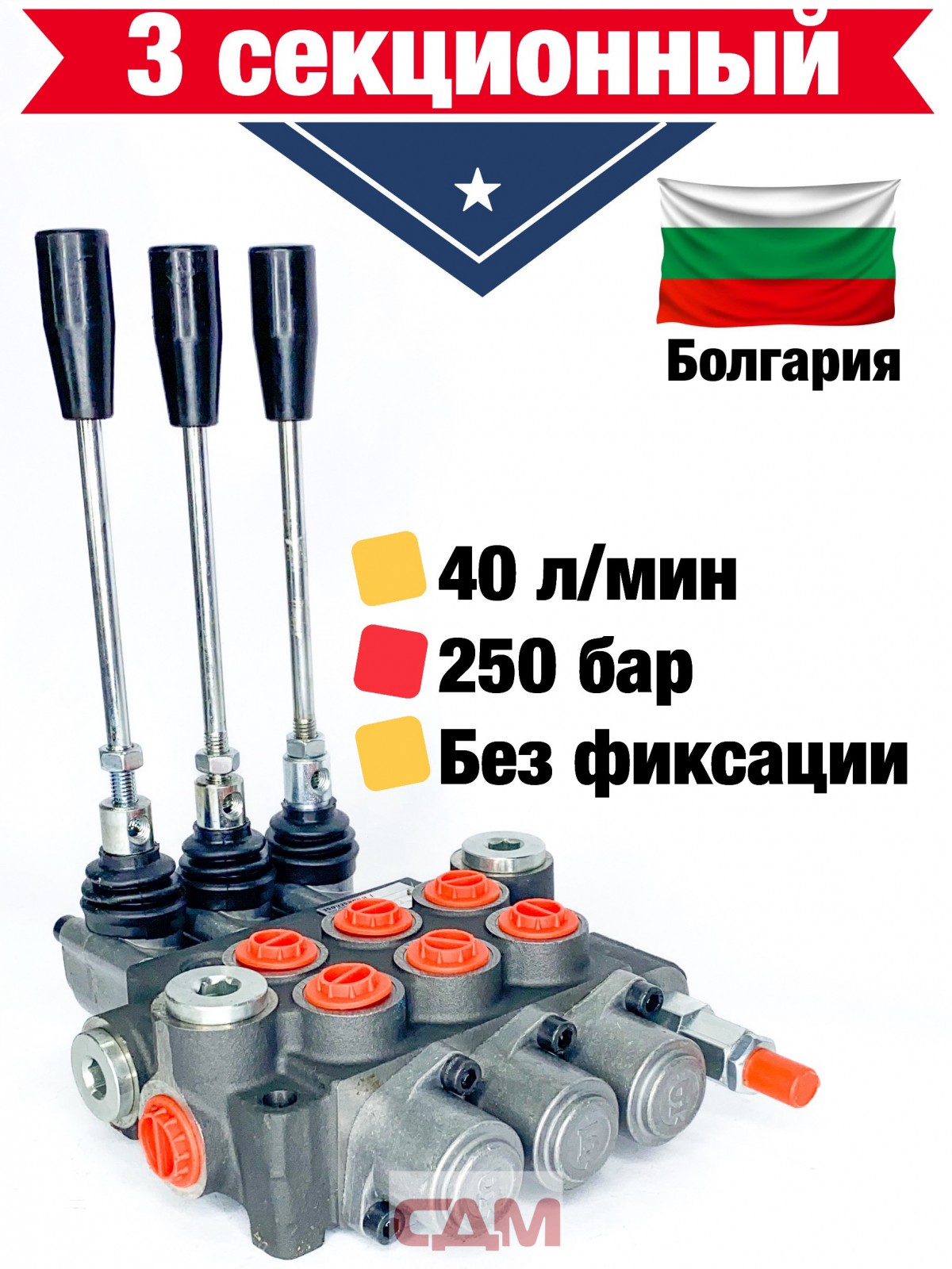 Гидрораспределитель болгарского производителя Badestnost - 3 золотника, режим подъема и опускания без фиксации. Линия N для последовательного соединения второго и последующего распределителя. Предохранительный клапан до 250 бар.